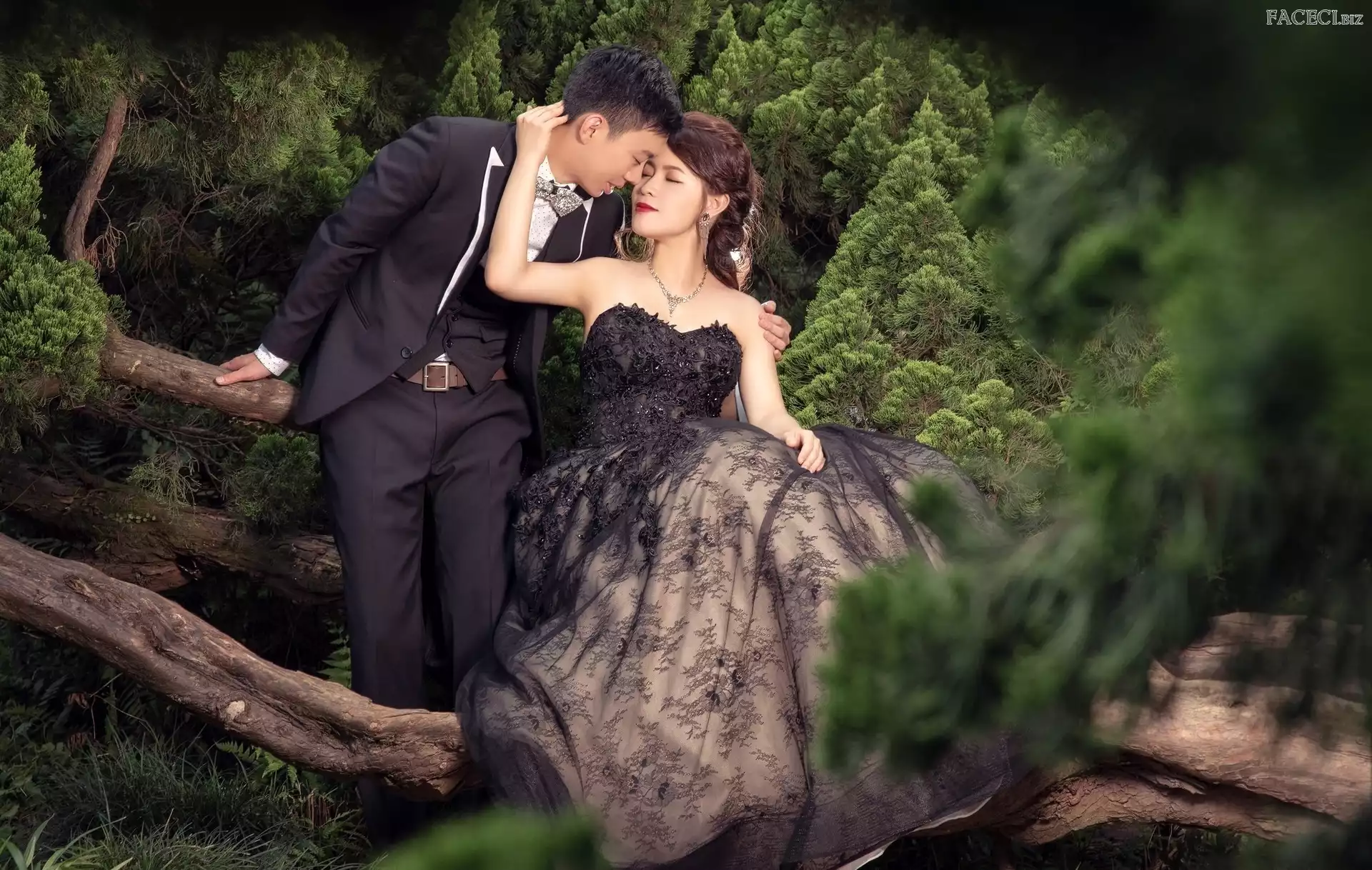 Suknia, Kobieta, Drzewa, Konary, Czarna, Mężczyzna - faceci.biz